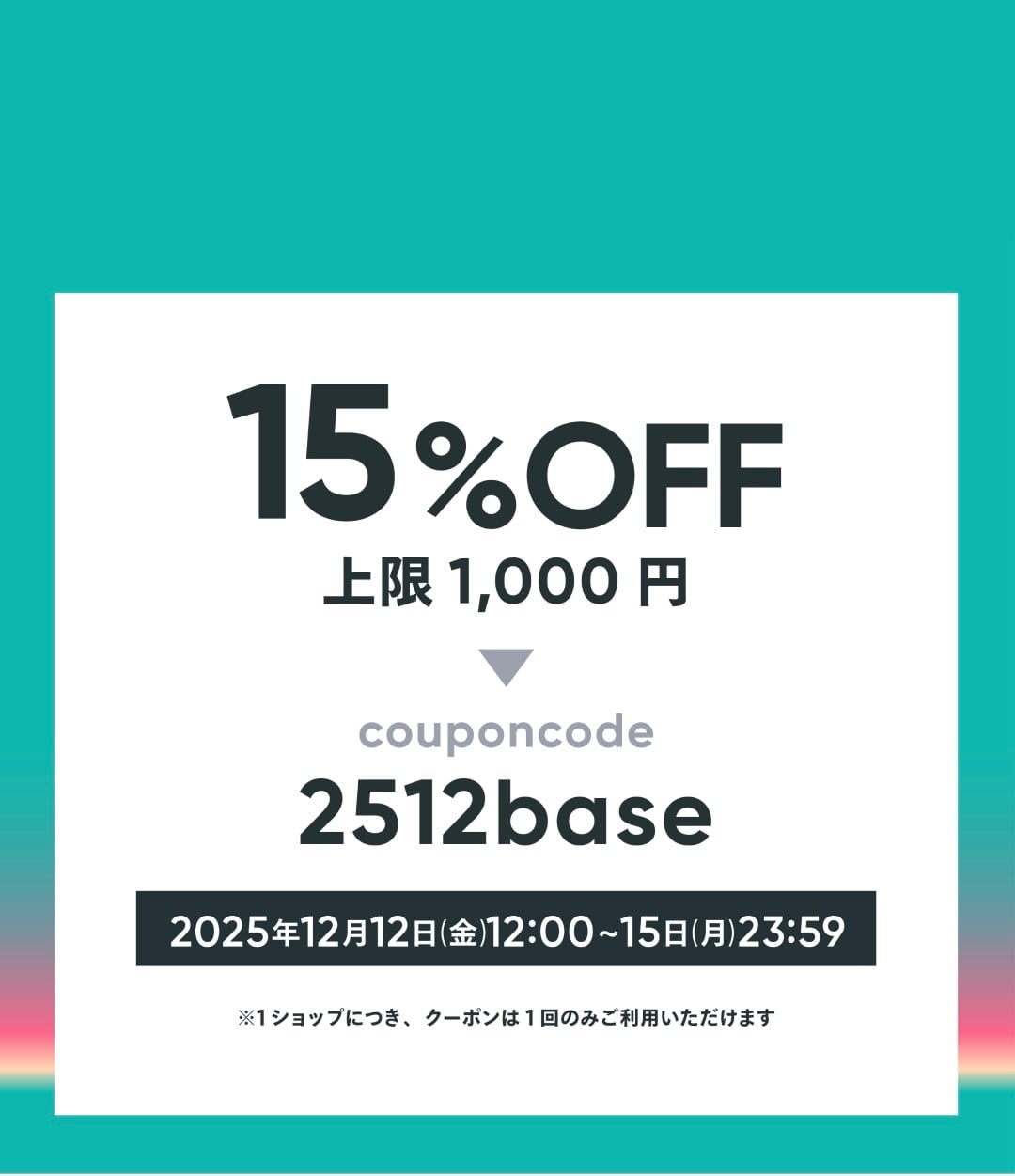 12/15 23:59まで使えるクーポンがございます。